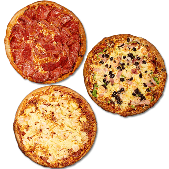 Tomato base pizza loaded with ham, salami, onion, capsicum, mushrooms, bacon, mozzarella, olives, pineapple, and prawns.Choose one